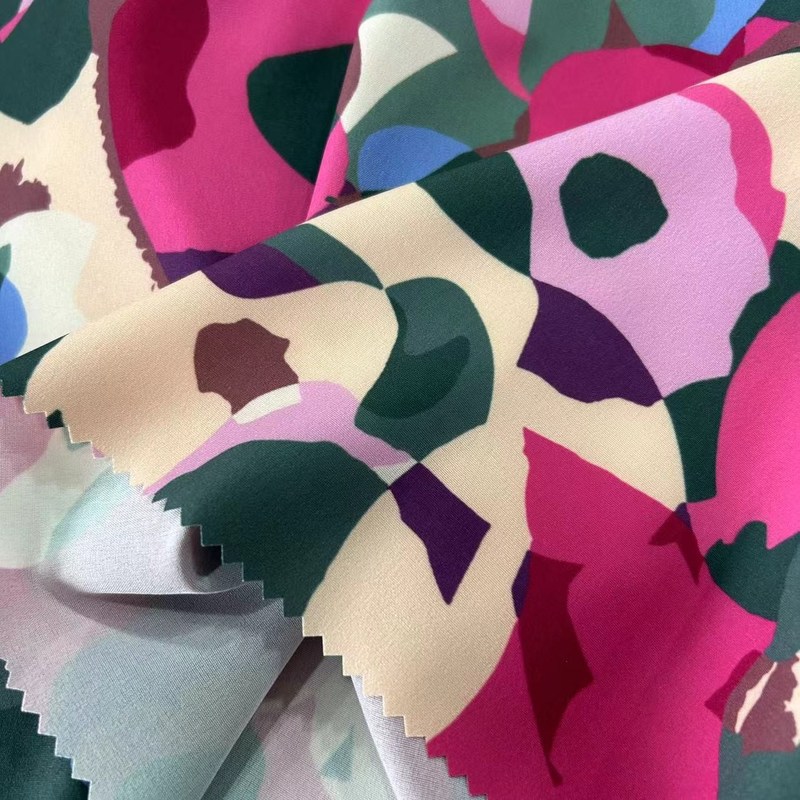 5. Einzigartiges Druckdesign: Das herausragende Merkmal dieses Stoffes ist sein abstraktes geometrisches Druckdesign.Die Kombination von leuchtenden Farben und kräftigen Formen erzeugt eine visuell fesselnde Wirkung, so dass es perfekt ist, um auffällige Kleidung zu kreieren.